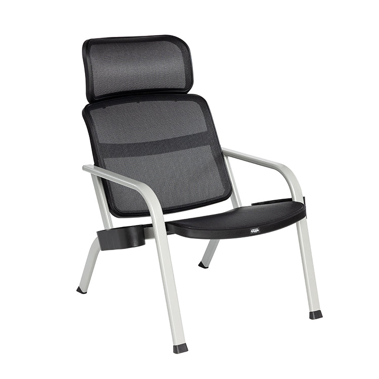 The classic Adirondack seat – a low, reclined built-to-chill profile – but comfortable. Quick-drying mesh is breathable and handles any conditions. Comes with snack tray and utility tray that snaps behind the head rest and holds a speaker to enhance the vibe.